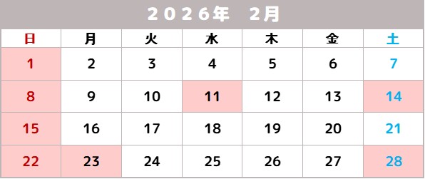 2月分の営業日をお知らせいたします。